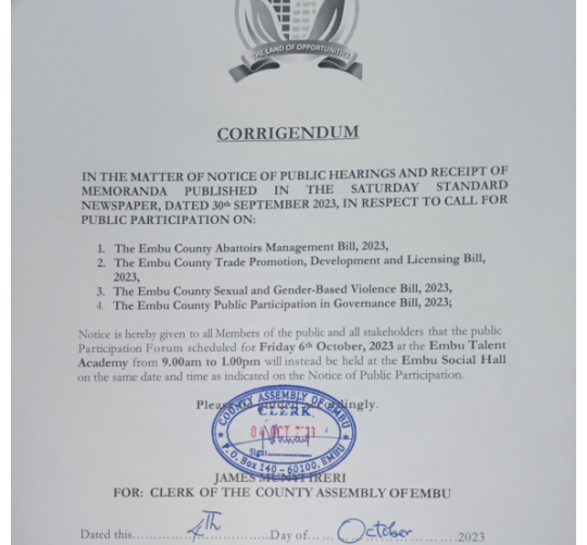 Continue Reading17TH OCTOBER 2023 Embu traders will now be required to pay for one business permit for different commercial activities under one roof after the enactment of a new law by the County Assembly. The Embu County Trade Promotion, Development and Licensing Bill, 2023, which was read a second time at the Assembly seeks to provide […]